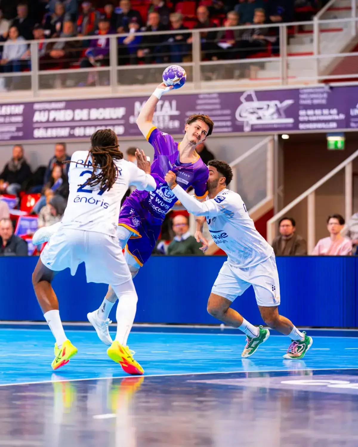 Mon quotidien se déroule au plus près de l'action, particulièrement sur les parquets et les terrains de la région. J'interviens très régulièrement lors de rencontres de handball et de basket-ball, deux disciplines dont je maîtrise parfaitement les codes et les rythmes. Cette immersion fréquente dans le milieu de la balle orange et du handball me permet de capturer l'instant T : celui où l'extension est maximale, où la tension défensive se lit sur les visages et où la stratégie se transforme en action concrète.